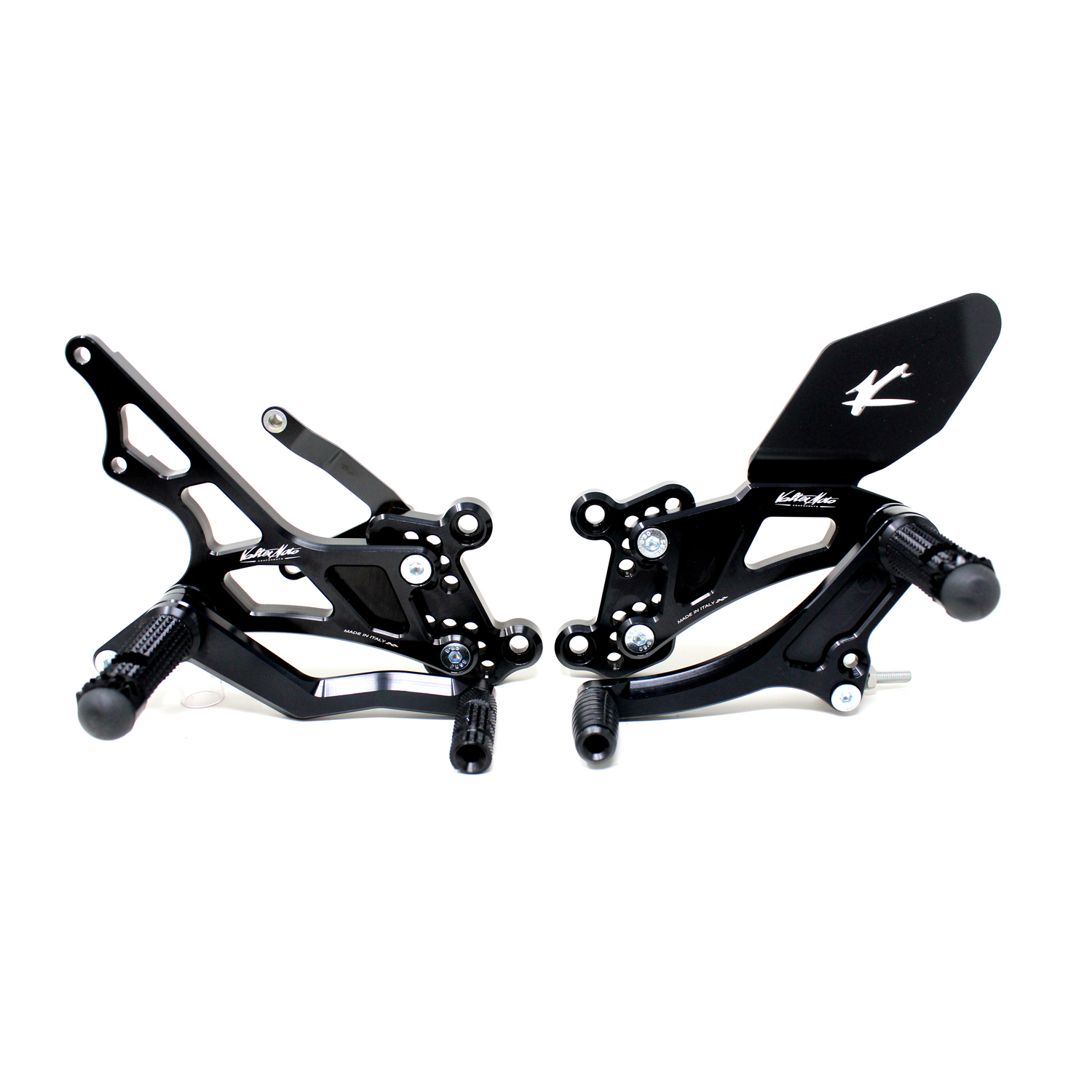 Adjustable Type 1.5 rearsets are developed for street/racing use, entirely made with CNC machinery in Ergal 7075 T5 alloy. Footpegs and frontpegs are made in aluminum alloy machined to obtain an optimal grip. Shift and brake levers are mounted on two ball bearings to avoid any friction. Adjustable plates allows from 6 to 9 different positions to find the best feeling on the bike. Rearsets are provided with black aluminum heel protections, the correct lenght shift rod, shift and brake ball joints, brake light pressure switch. All spare parts are available. TÜV approved KBA homologated with ABE number.