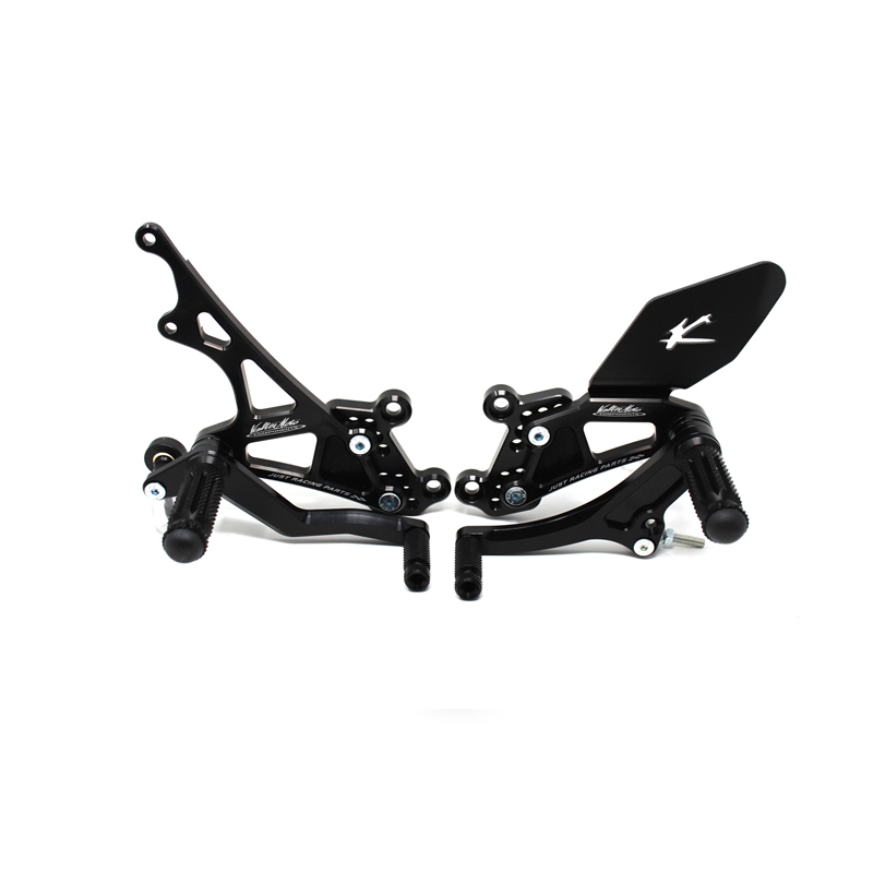 Adjustable Type 1.5 rearsets are developed for street/racing use, entirely made with CNC machinery in Ergal 7075 T5 alloy. Footpegs and frontpegs are made in aluminum alloy machined to obtain an optimal grip. Shift and brake levers are mounted on two ball bearings to avoid any friction. Adjustable plates allows from 6 to 9 different positions to find the best feeling on the bike. Rearsets are provided with black aluminum heel protections, the correct lenght shift rod, shift and brake ball joints, brake light pressure switch. All spare parts are available. TÜV approved KBA homologated with ABE number.
