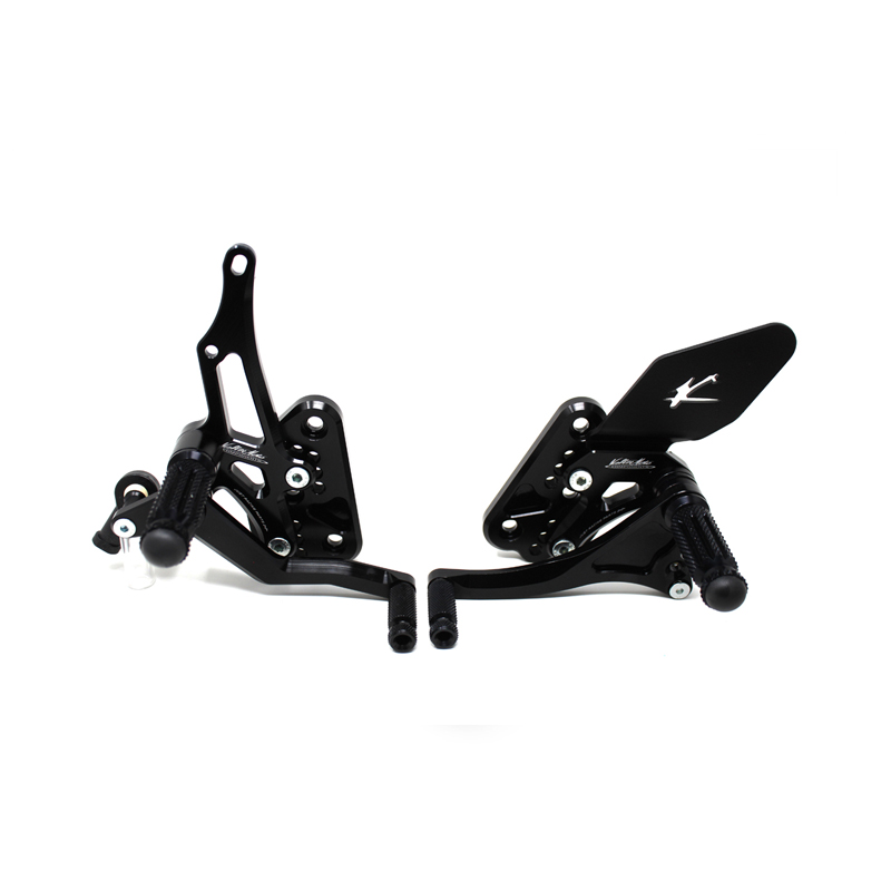 Adjustable Type 1.5 rearsets are developed for street/racing use, entirely made with CNC machinery in Ergal 7075 T5 alloy. Footpegs and frontpegs are made in aluminum alloy machined to obtain an optimal grip. Shift and brake levers are mounted on two ball bearings to avoid any friction. Adjustable plates allows from 6 to 9 different positions to find the best feeling on the bike. Rearsets are provided with black aluminum heel protections, the correct lenght shift rod, shift and brake ball joints, brake light pressure switch. All spare parts are available. TÜV approved KBA homologated with ABE number.