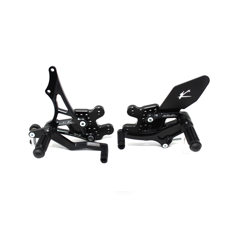 Adjustable Type 1.5 rearsets are developed for street/racing use, entirely made with CNC machinery in Ergal 7075 T5 alloy. Footpegs and frontpegs are made in aluminum alloy machined to obtain an optimal grip. Shift and brake levers are mounted on two ball bearings to avoid any friction. Adjustable plates allows from 6 to 9 different positions to find the best feeling on the bike. Rearsets are provided with black aluminum heel protections, the correct lenght shift rod, shift and brake ball joints, brake light pressure switch. All spare parts are available. TÜV approved KBA homologated with ABE number.