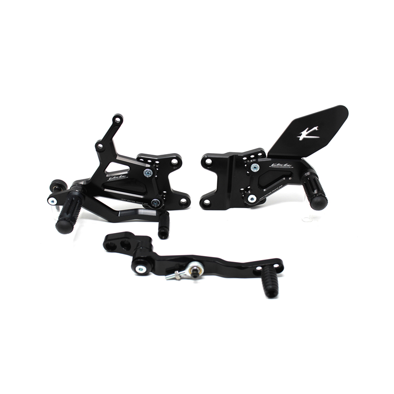 Adjustable Type 1.5 rearsets are developed for street/racing use, entirely made with CNC machinery in Ergal 7075 T5 alloy. Footpegs and frontpegs are made in aluminum alloy machined to obtain an optimal grip. Shift and brake levers are mounted on two ball bearings to avoid any friction. Adjustable plates allows from 6 to 9 different positions to find the best feeling on the bike. Rearsets are provided with black aluminum heel protections, the correct lenght shift rod, shift and brake ball joints, brake light pressure switch. All spare parts are available.