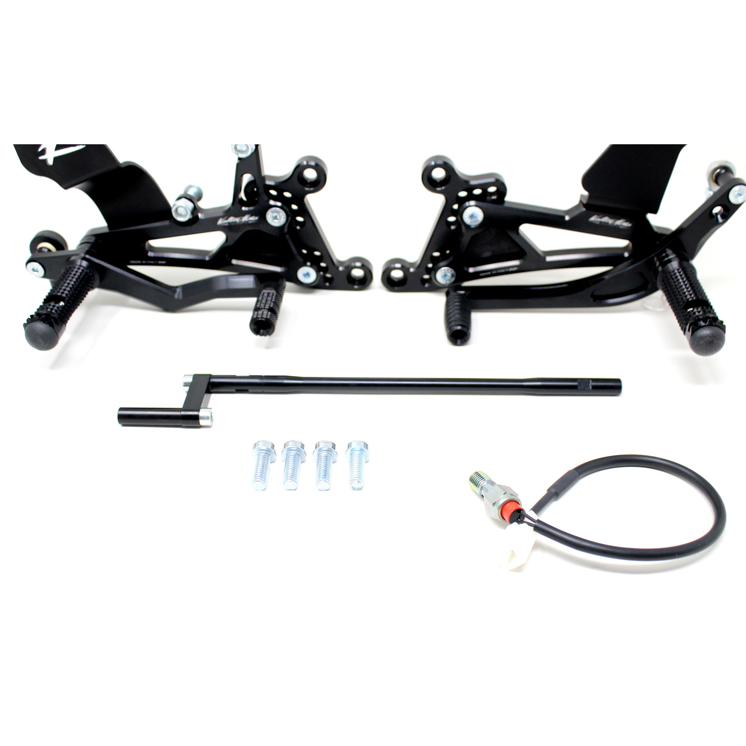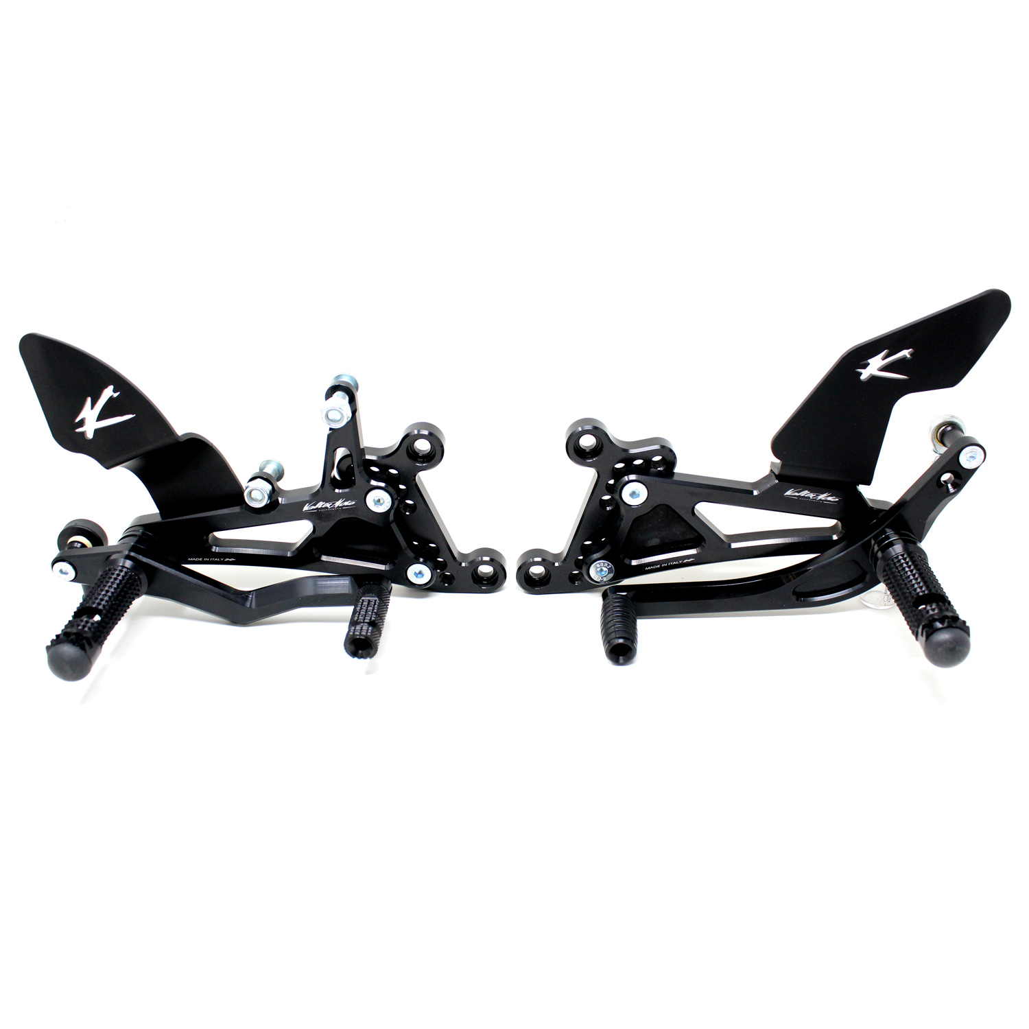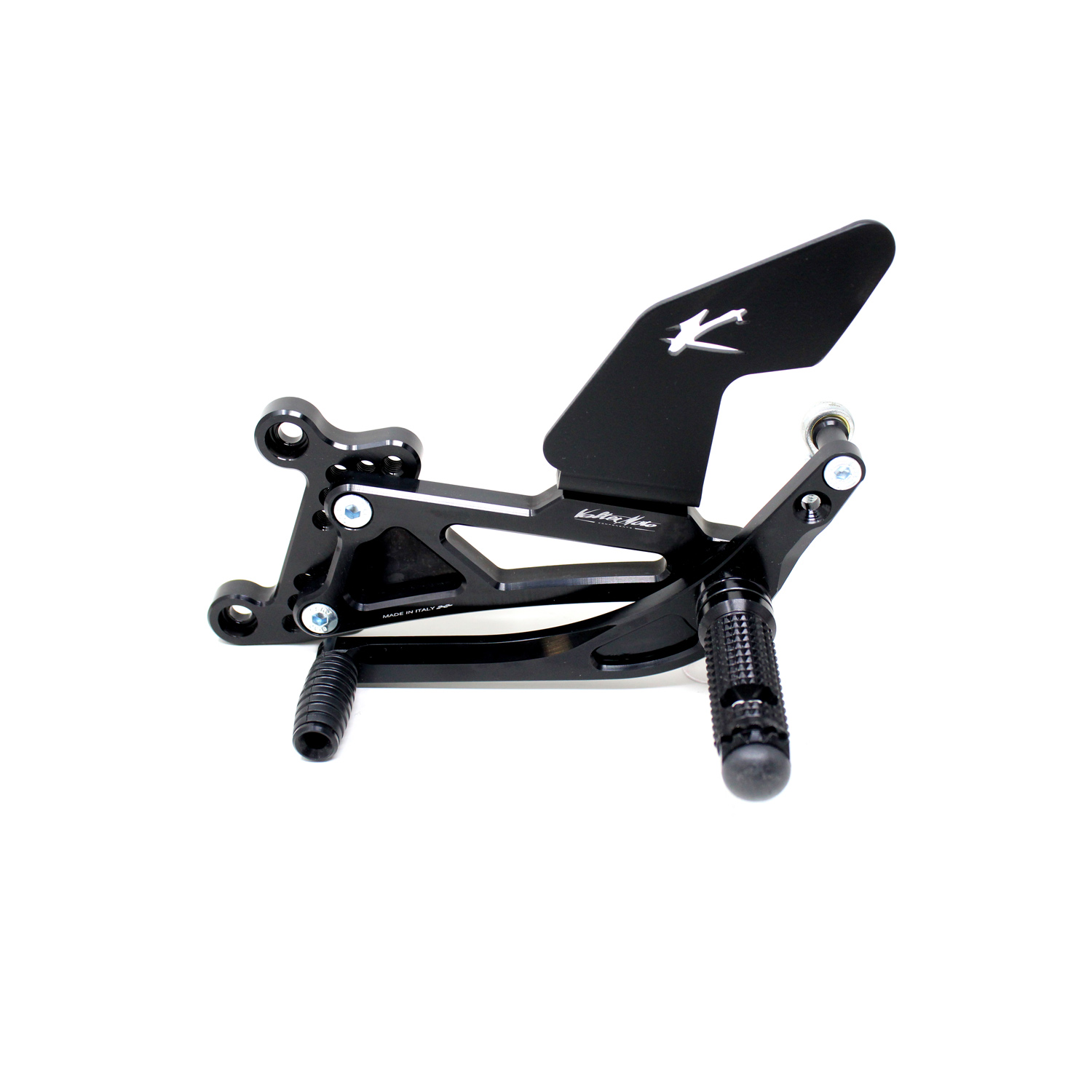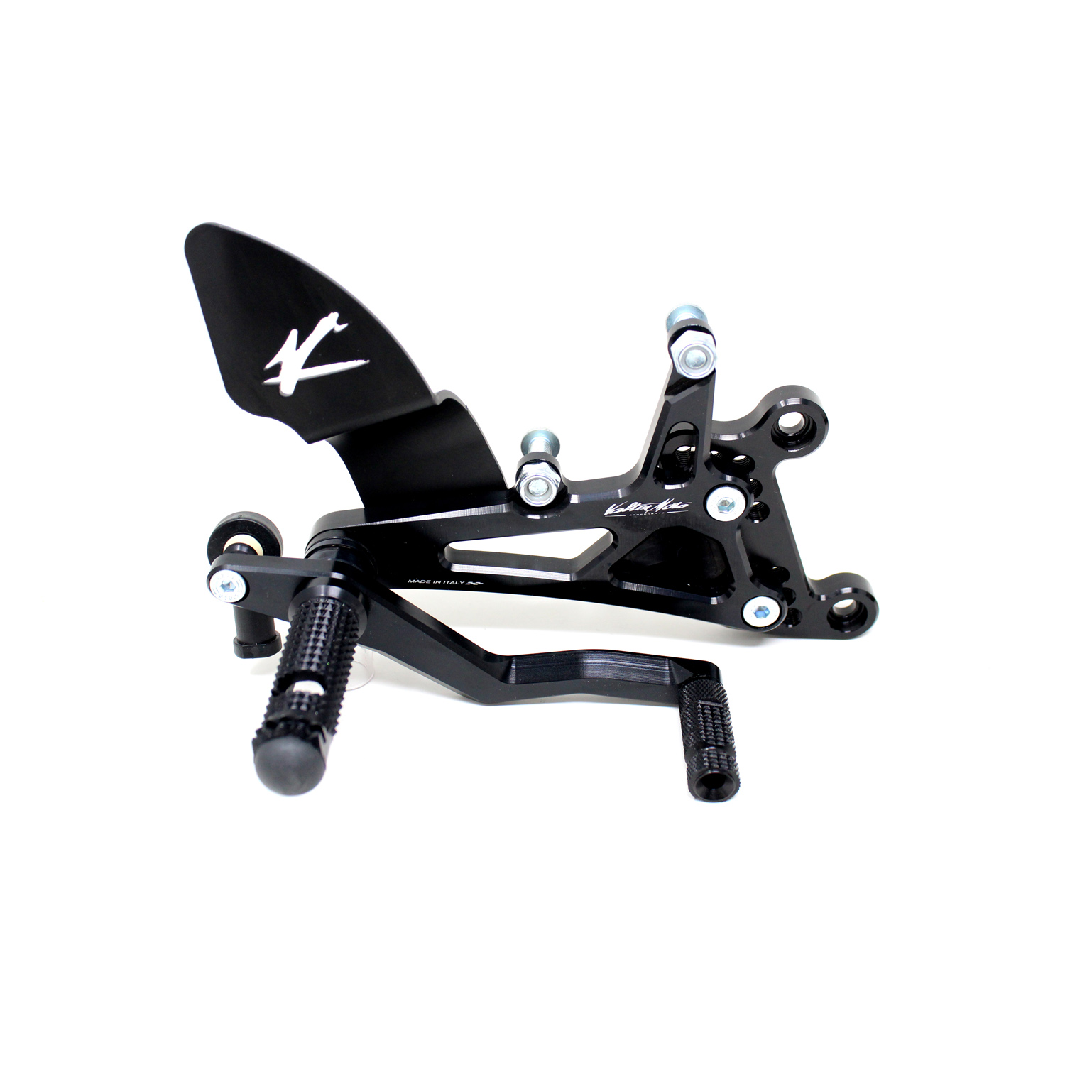Adjustable Type 1.5 rearsets are developed for street/racing use, entirely made with CNC machinery in Ergal 7075 T5 alloy. Footpegs and frontpegs are made in aluminum alloy machined to obtain an optimal grip. Shift and brake levers are mounted on two ball bearings to avoid any friction. Adjustable plates allows from 6 to 9 different positions to find the best feeling on the bike. Rearsets are provided with black aluminum heel protections, the correct lenght shift rod, shift and brake ball joints, brake light pressure switch. All spare parts are available.