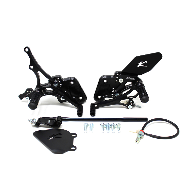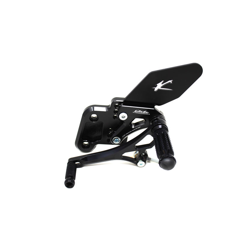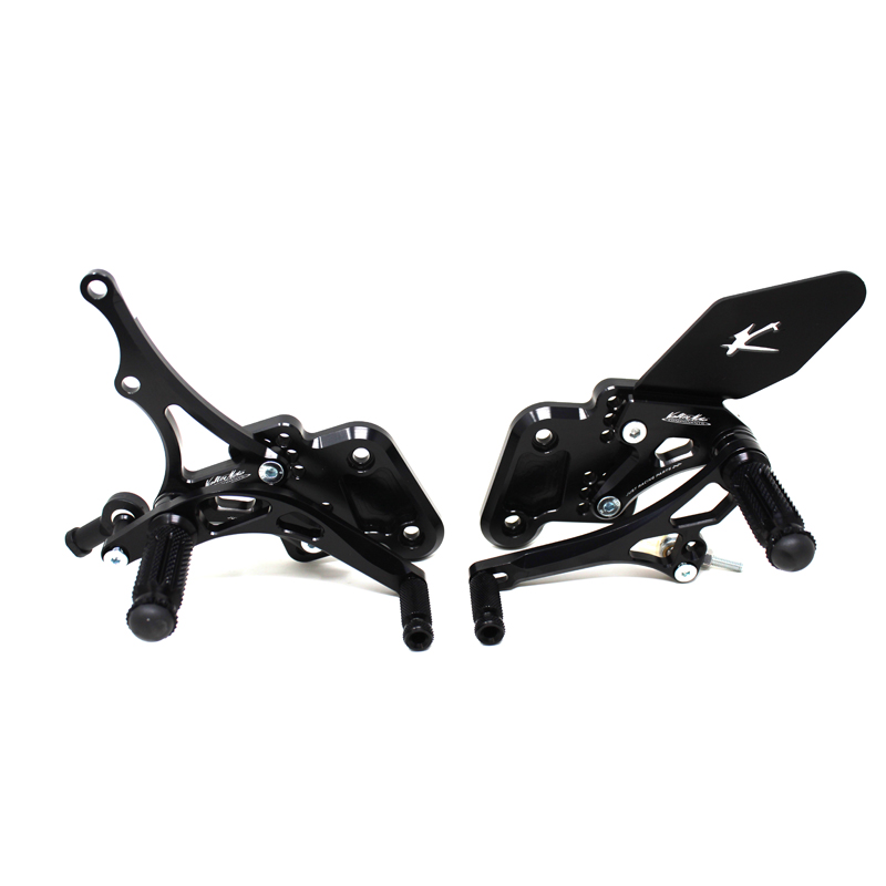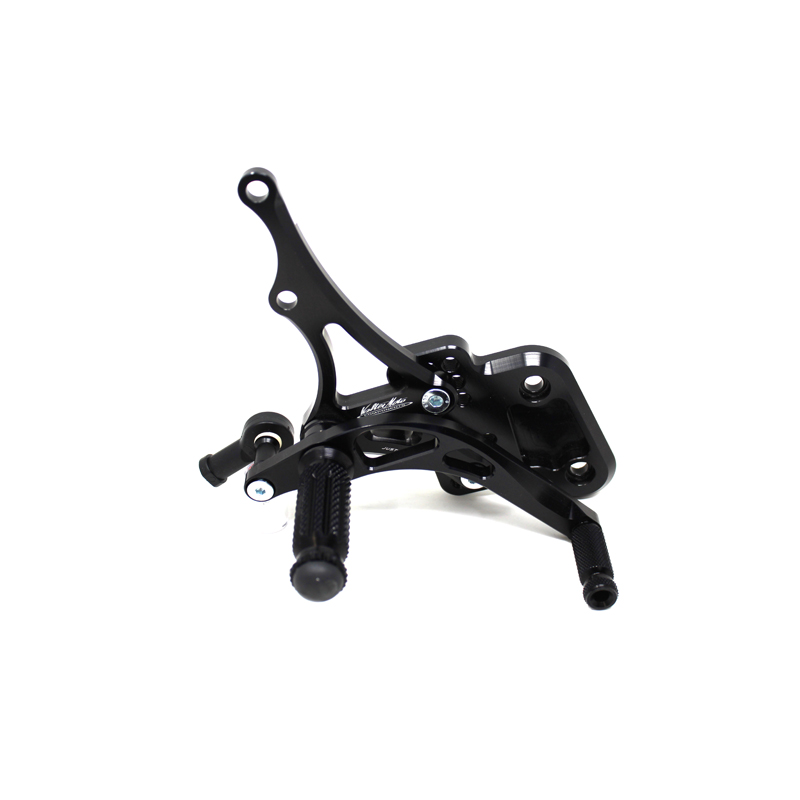 Adjustable Type 1.5 rearsets are developed for street/racing use, entirely made with CNC machinery in Ergal 7075 T5 alloy. Footpegs and frontpegs are made in aluminum alloy machined to obtain an optimal grip. Shift and brake levers are mounted on two ball bearings to avoid any friction. Adjustable plates allows from 6 to 9 different positions to find the best feeling on the bike. Rearsets are provided with black aluminum heel protections, the correct lenght shift rod, shift and brake ball joints, brake light pressure switch. All spare parts are available. TÜV approved KBA homologated with ABE number.