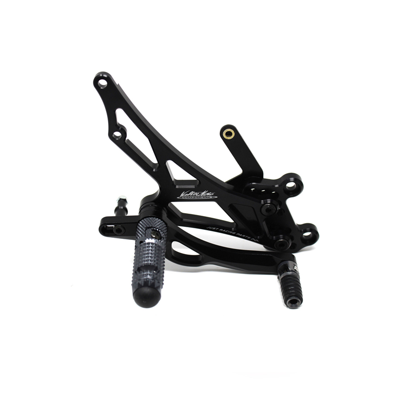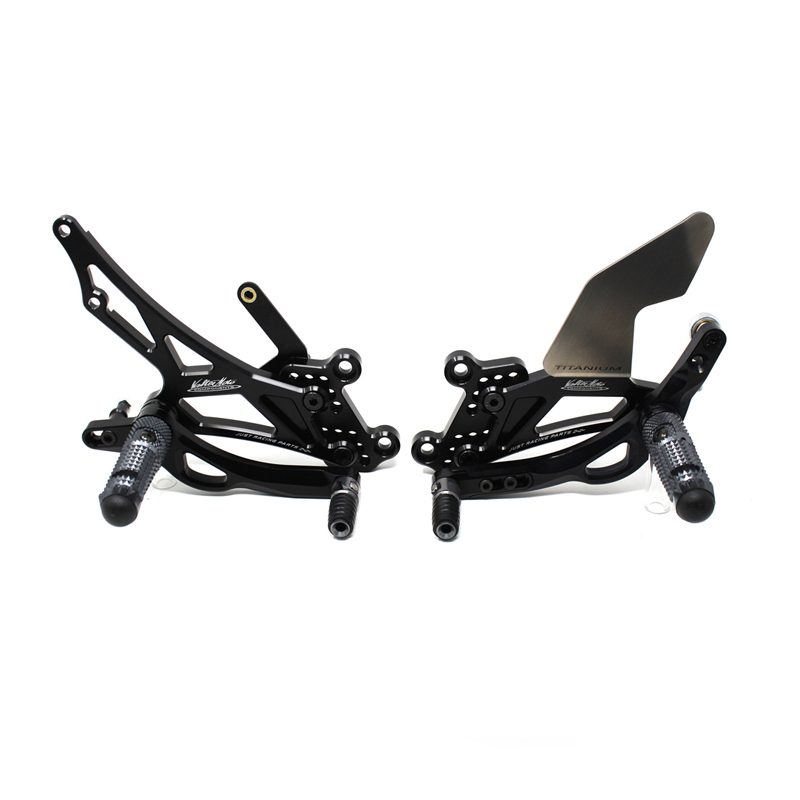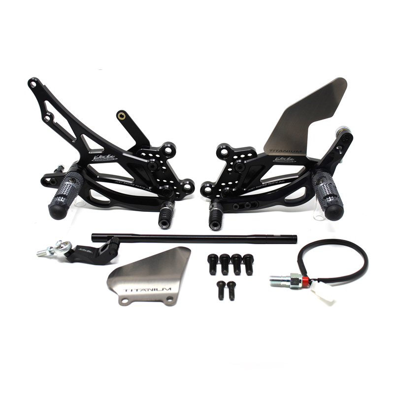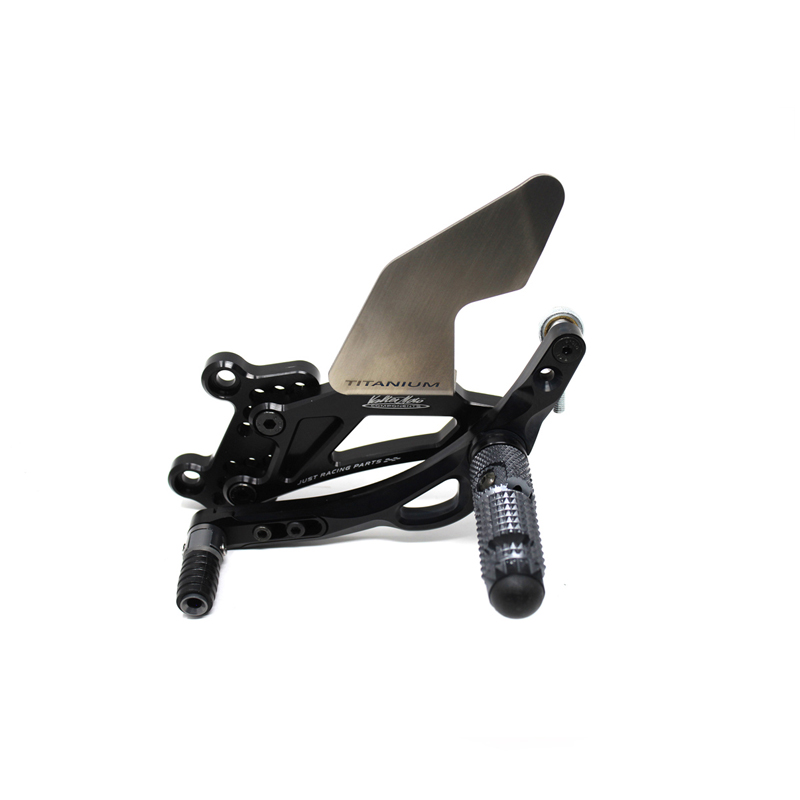 Adjustable Type 3.5 rearsets are developed mainly for racing use, are entirely made with CNC machinery in Ergal 7075 T5 alloy and are the Top Range model used in the most important world racing championships. Aluminium high grip footpegs are provided with nylon caps, they are both fold up but it is possible to block them in standard position by the steel pin included. Aluminum fix frontpegs are more ergonomic and easy for braking and shifting; Shift and brake levers are lightened, allows to adjust both sensibility and they are mounted on two ball bearings to avoid any friction. Shift frontpeg has a special rail system to adjust lenght position approximately 10 mm. Drilled plates allows from 6 to 9 different positions to find the best position on the bike. Rearsets are equipped with exclusive Titanium Line heel protections and provided with the correct lenght shift rod, ball joints and brake light pressure switch. All spare parts are available. TÜV approved KBA homologated with ABE number. Rearsets with reverse shift.