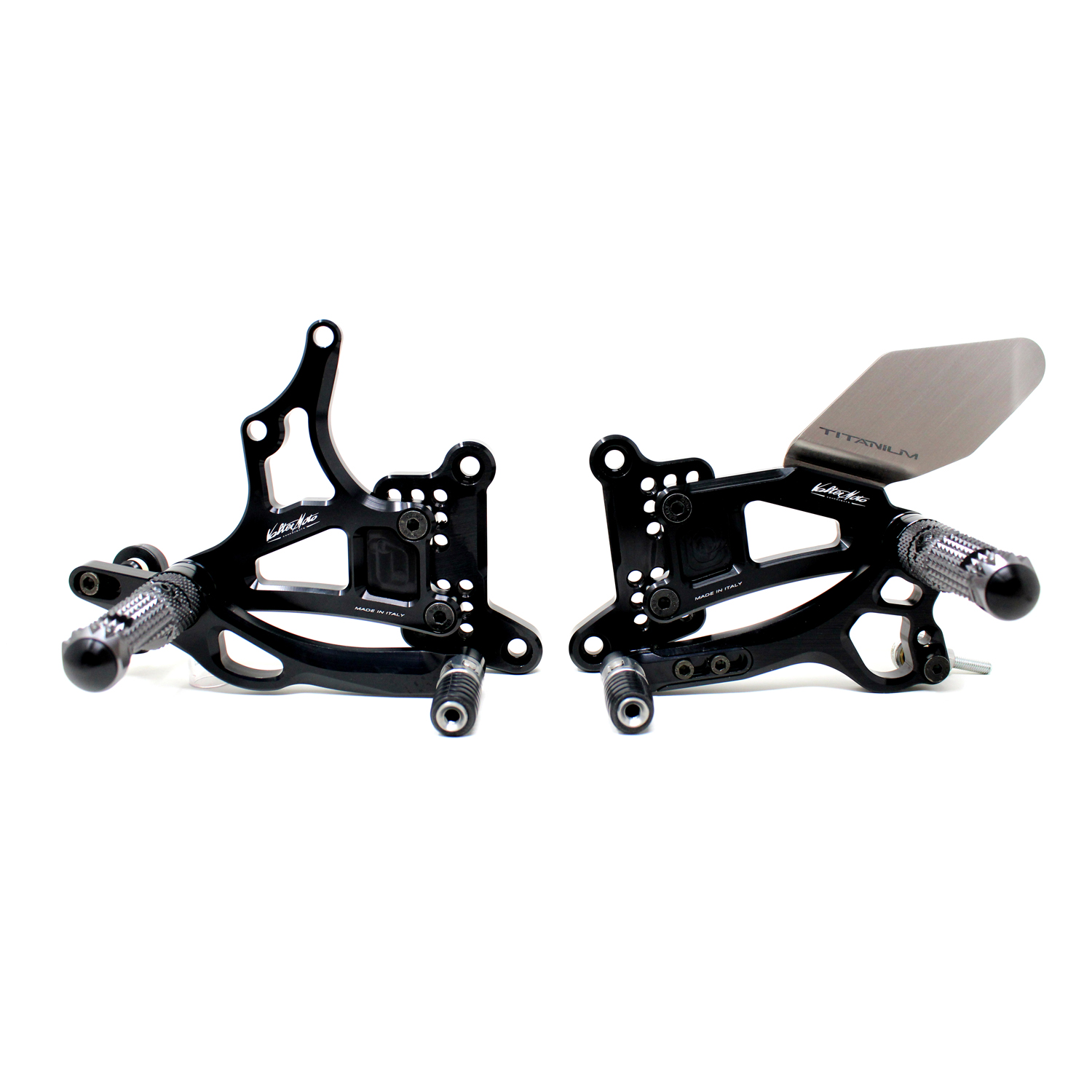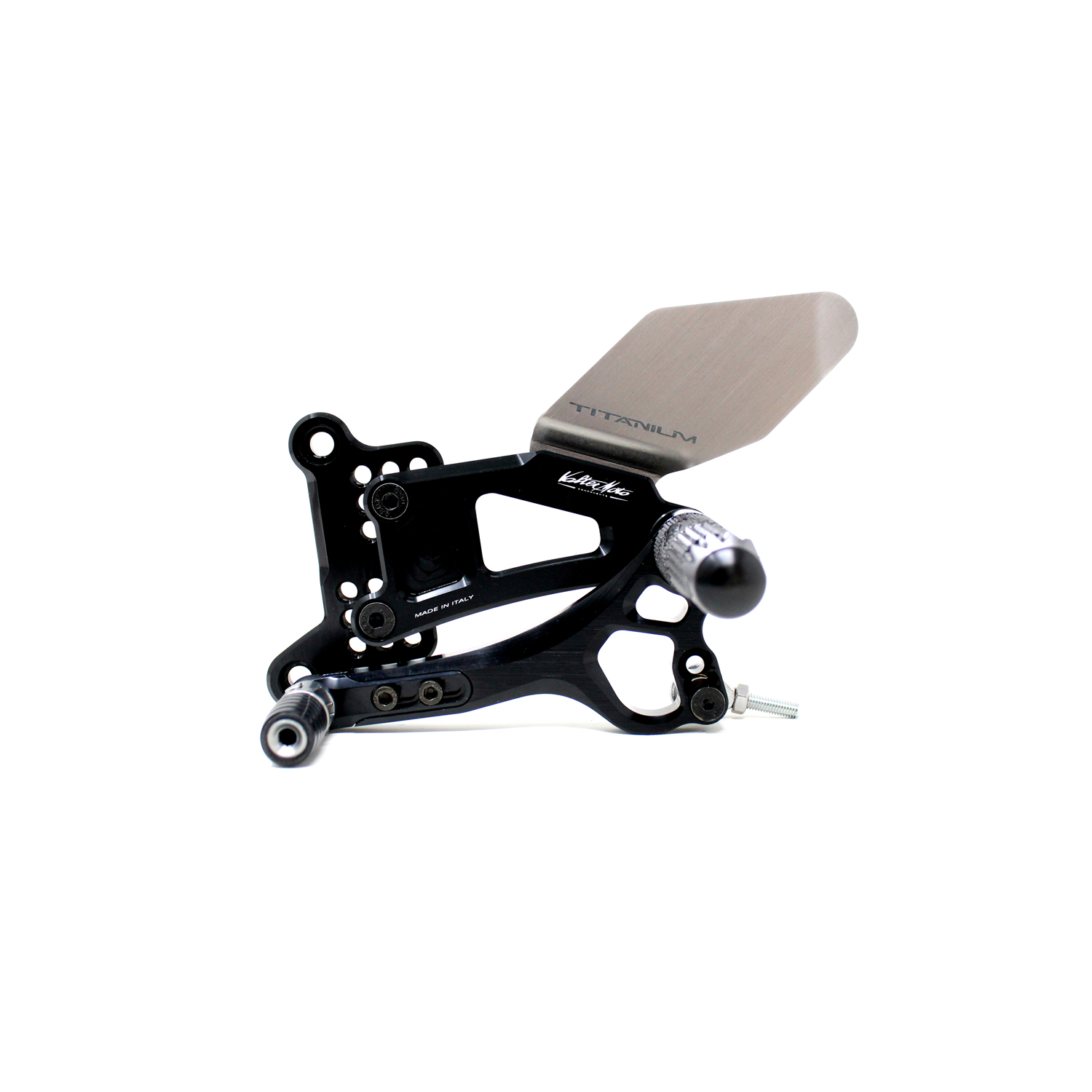 Adjustable Type 3.5 rearsets are developed mainly for racing use, are entirely made with CNC machinery in Ergal 7075 T5 alloy and are the Top Range model used in the most important world racing championships. Aluminium high grip footpegs are provided with nylon caps, they are both fold up but it is possible to block them in standard position by the steel pin included. Aluminum fix frontpegs are more ergonomic and easy for braking and shifting; Shift and brake levers are lightened, allows to adjust both sensibility and they are mounted on two ball bearings to avoid any friction. Shift frontpeg has a special rail system to adjust lenght position approximately 10 mm. Drilled plates allows from 6 to 9 different positions to find the best position on the bike. Rearsets are equipped with exclusive Titanium Line heel protections and provided with the correct lenght shift rod, ball joints and brake light pressure switch. All spare parts are available.