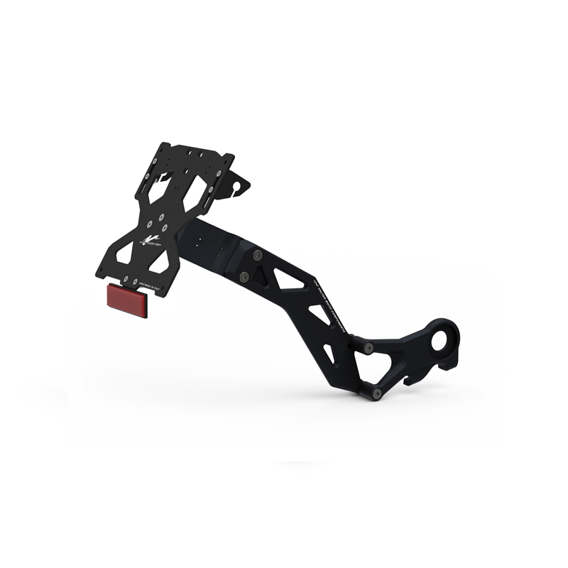 King license plate holder is developed to move down the license plate over rear wheel. Both Arm and fixing device are made with Ergal 7075 and are fixed to the swingarm by the wheel axle. It allows to change plate inclination and height to find the correct position. Cable wires for license light and turn light indicators is included. It is provided with all mounting parts needed and with dedicated undertail hole cover. Aluminum led light is included. (PRTL03) color black.