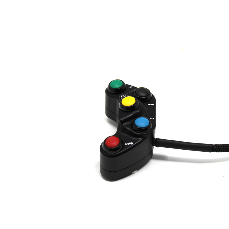 Presetted 5 buttons control panel made from solid aluminum CNC machined. This clutch side model of control panel is equipped with 5 buttons with different functions. The plug & play system allows to control UP, DOWN, MODE, PIT LIMITER, MAP1/2, TAIL LIGHT.
