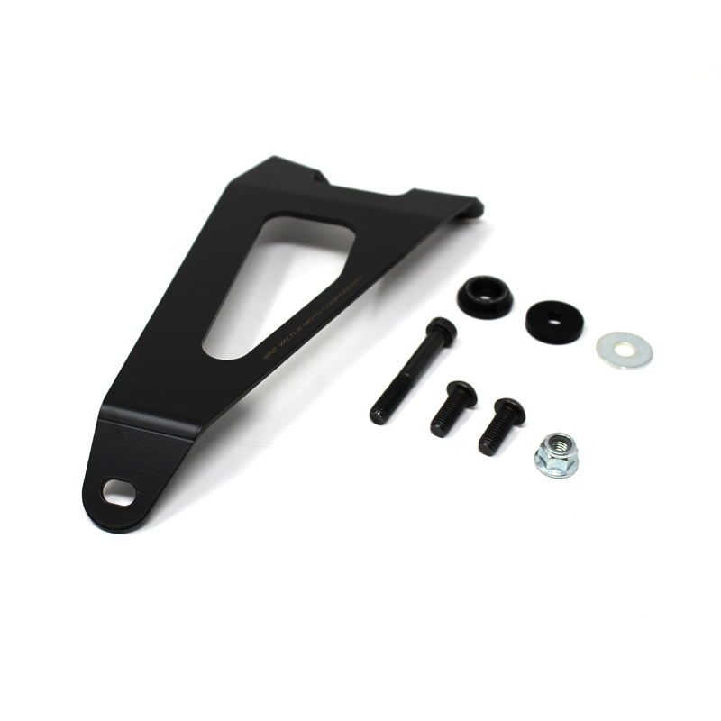 Steel muffler bracket developed with professional racing Team easy to mount instead of OEM part. Lighter than OEM bracket is available in matte black color only and provided with an aluminum conical spacer marked Valter Moto Components.