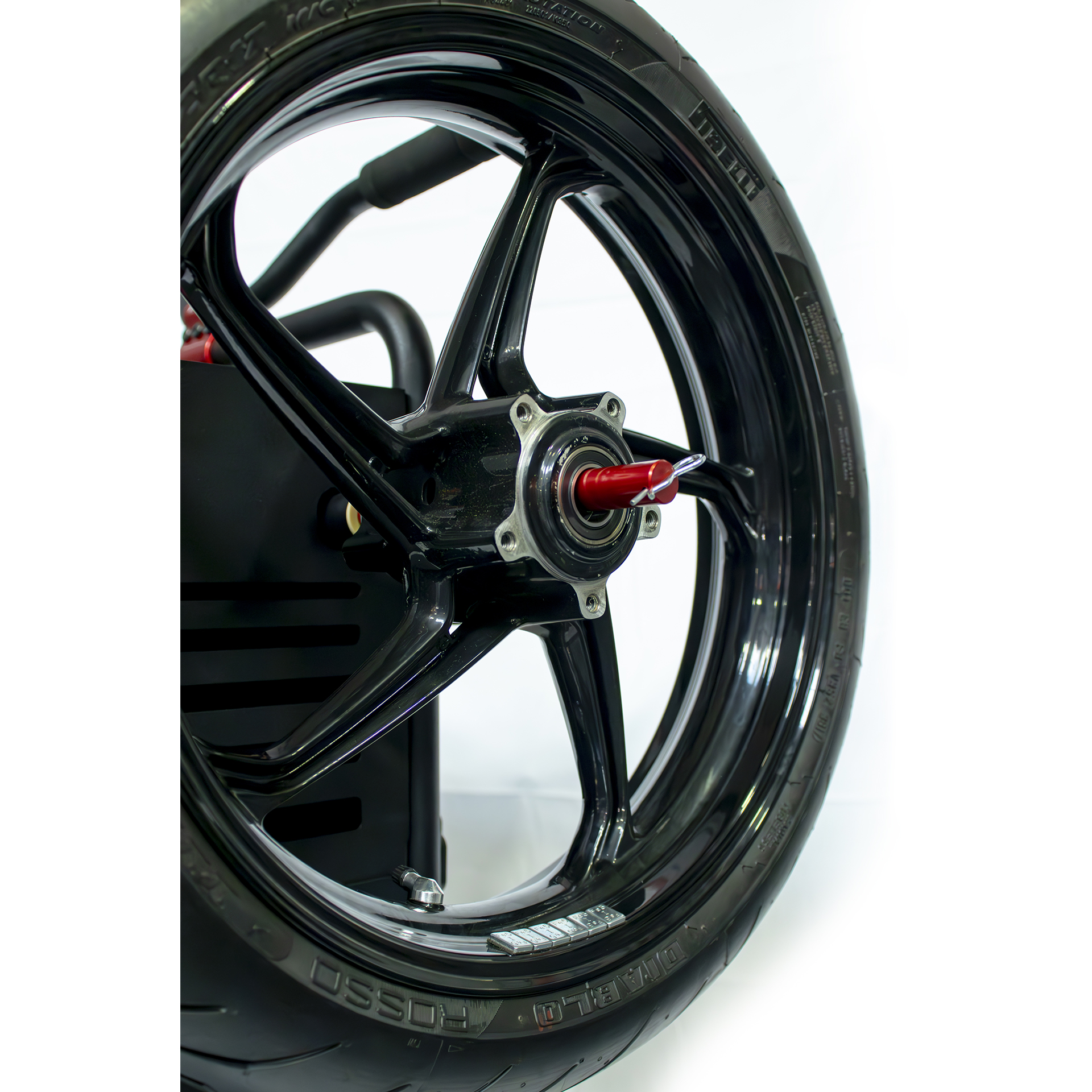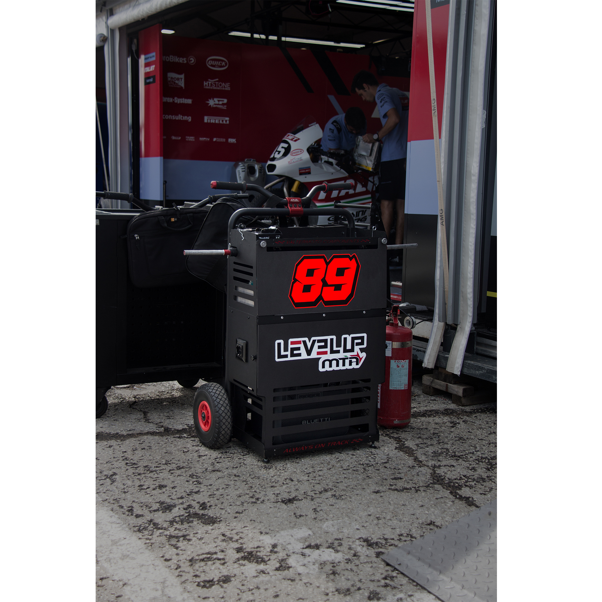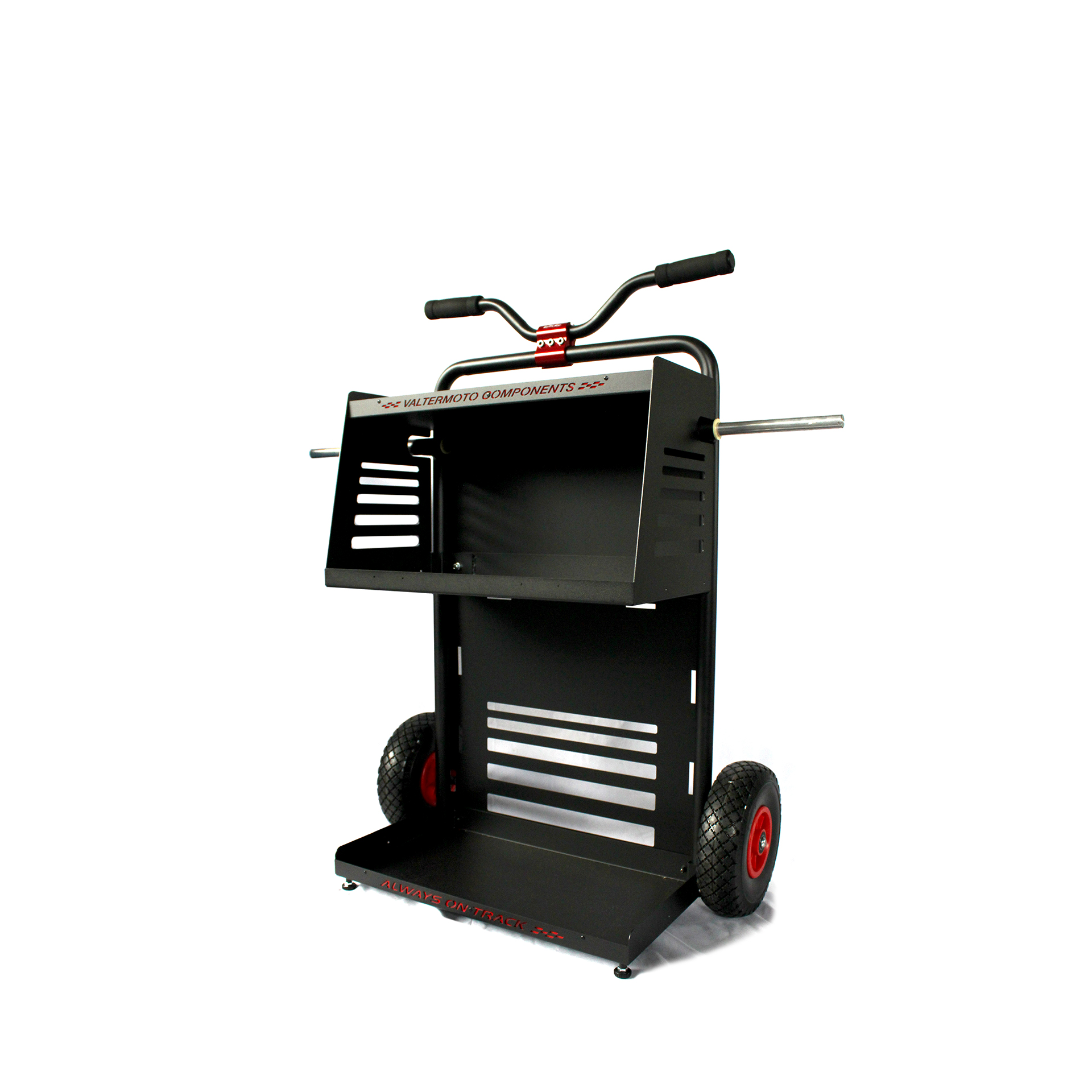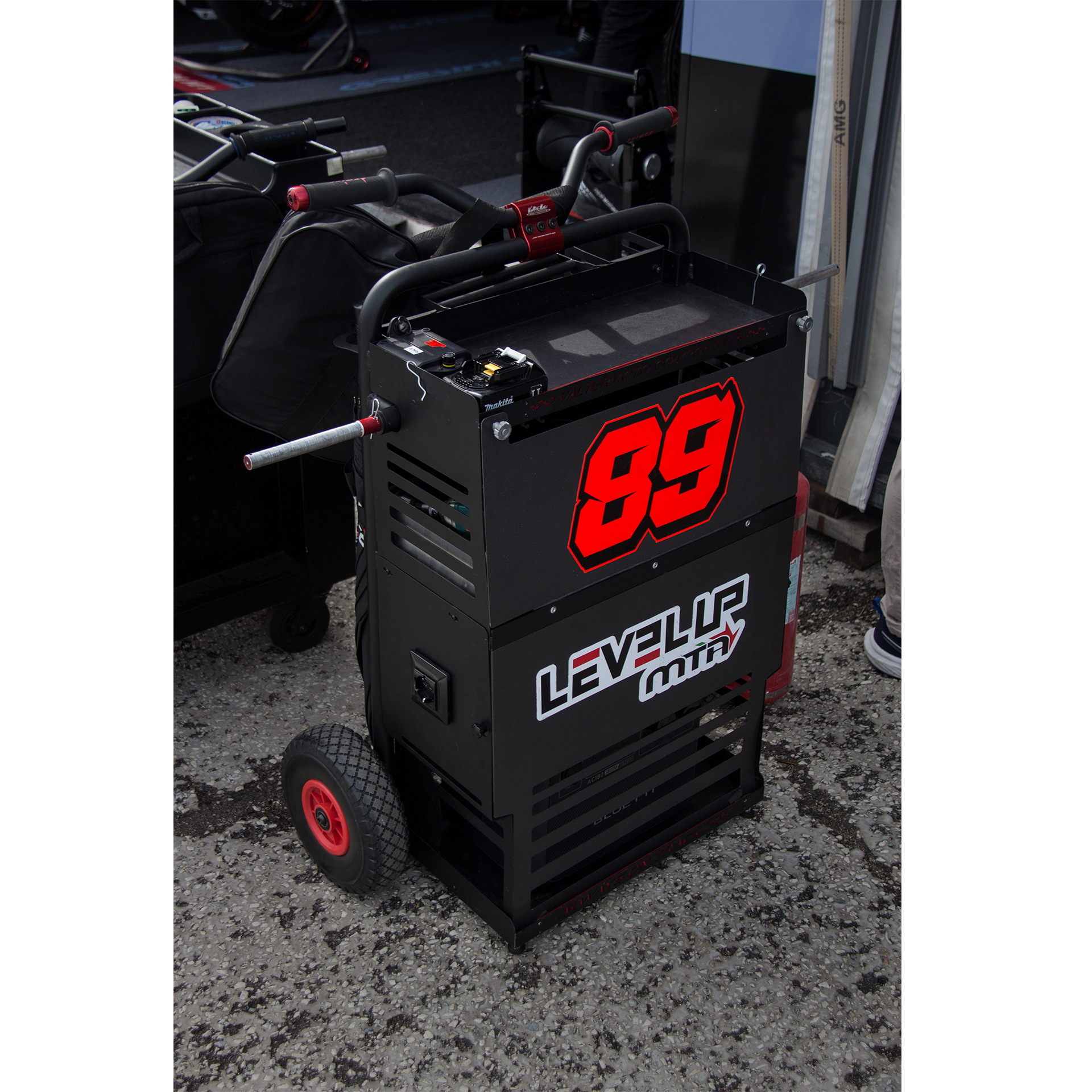 Il nuovo carrello Pit Lane Standard a due ruote, è stato allargato per poter contenere i nuovi generatori da 2000w ed è stato progettato per la predisposizione del montaggio del ‘Kit terza ruota’. Il portacerchi è anodizzato rosso.