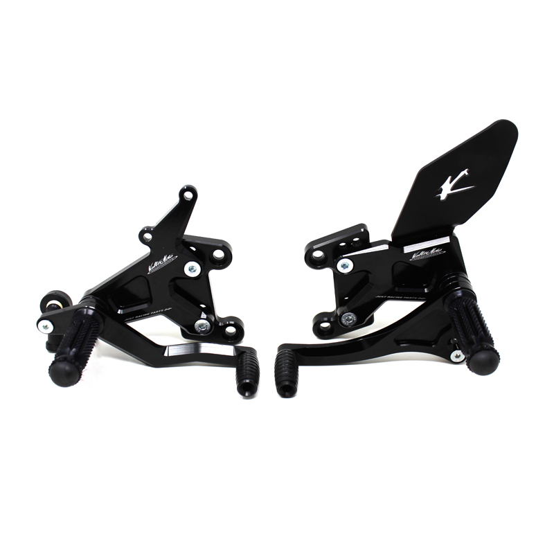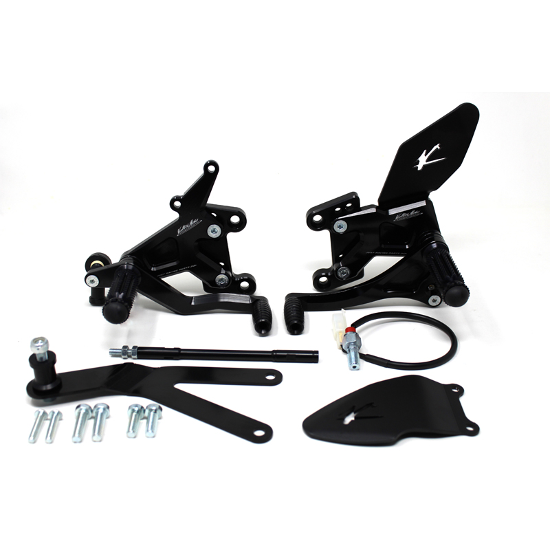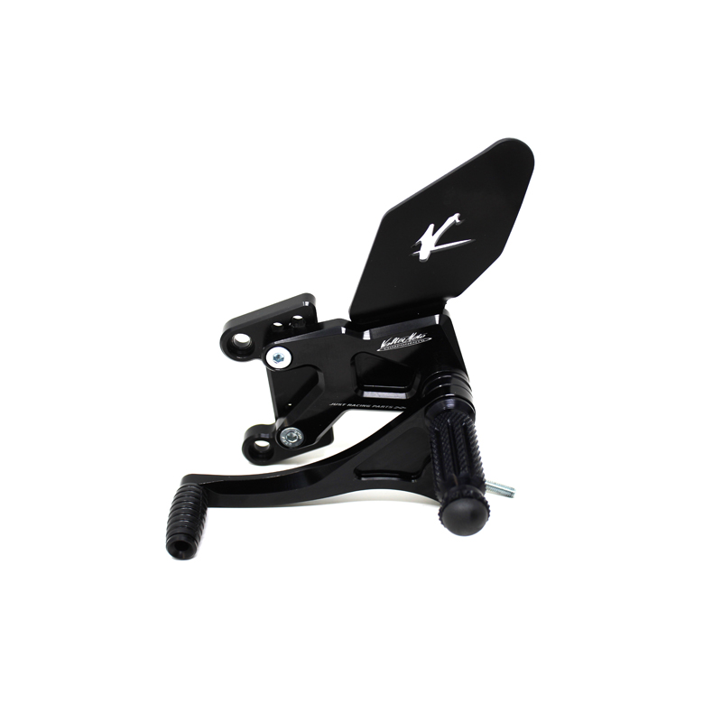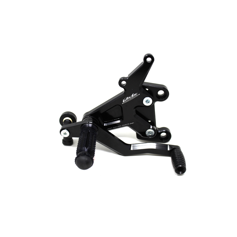 Le pedane regolabili Tipo 1.5 sono interamente realizzate in Ergal 7075 T5 lavorato su centri di lavoro CNC ed il loro utilizzo è consigliato per strada e pista. I poggiapiedi e i puntalini in alluminio sono lavorati per garantire un grip ottimale. Le leve cambio e freno sono entrambe montate su 2 cuscinetti a sfera per ridurre al minimo l'attrito. Le piastre regolabili permettono da 6 a 9 posizioni diverse delle pedane consentendo di trovare il miglior set-up per il proprio stile di guida. Il kit comprende le alette paratacco in alluminio, tutta la viteria necessaria per il montaggio, l'asta cambio della corretta lunghezza, gli snodi sferici lato cambio e lato freno e l'interruttore a pressione per la luce stop. Per le pedane VMC sono sempre disponibili tutti i ricambi. Pedana con cambio rovesciato.
