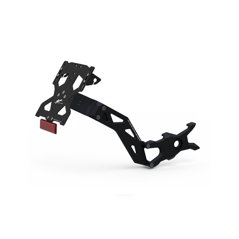 Il portatarga KING sviluppato da VMC permette di spostare la posizione della targa da sotto il codone alla zona vicina alla ruota posteriore. Il sistema di fissaggio al forcellone è realizzato in Ergal 7075 lavorati dal pieno con macchine CNC. Il sistema di montaggio offre diverse possibilità di regolazione della piastra portatarga per trovare il posizionamento desiderato. Nella confezione è inoltre incluso il cablaggio per connettere la luce targa e le frecce all'impianto della moto. Il kit di montaggio incluso comprende tutti i componenti necessari per il montaggio. Viene fornita anche una piastrina in acciaio per coprire il foro lasciato sotto il codone dal portatarga di serie. La luce in alluminio led è inclusa. (PRTL03) colore nero.