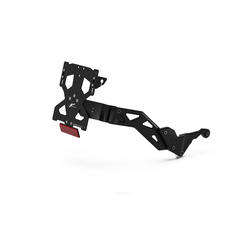 Il portatarga KING sviluppato da VMC permette di spostare la posizione della targa da sotto il codone alla zona vicina alla ruota posteriore. Il sistema di fissaggio al forcellone è realizzato in Ergal 7075 lavorati dal pieno con macchine CNC. Il sistema di montaggio offre diverse possibilità di regolazione della piastra portatarga per trovare il posizionamento desiderato. Nella confezione è inoltre incluso il cablaggio per connettere la luce targa e le frecce all'impianto della moto. Il kit di montaggio incluso comprende tutti i componenti necessari per il montaggio. Viene fornita anche una piastrina in acciaio per coprire il foro lasciato sotto il codone dal portatarga di serie. La luce in alluminio led è inclusa. (PRTL03) colore nero.