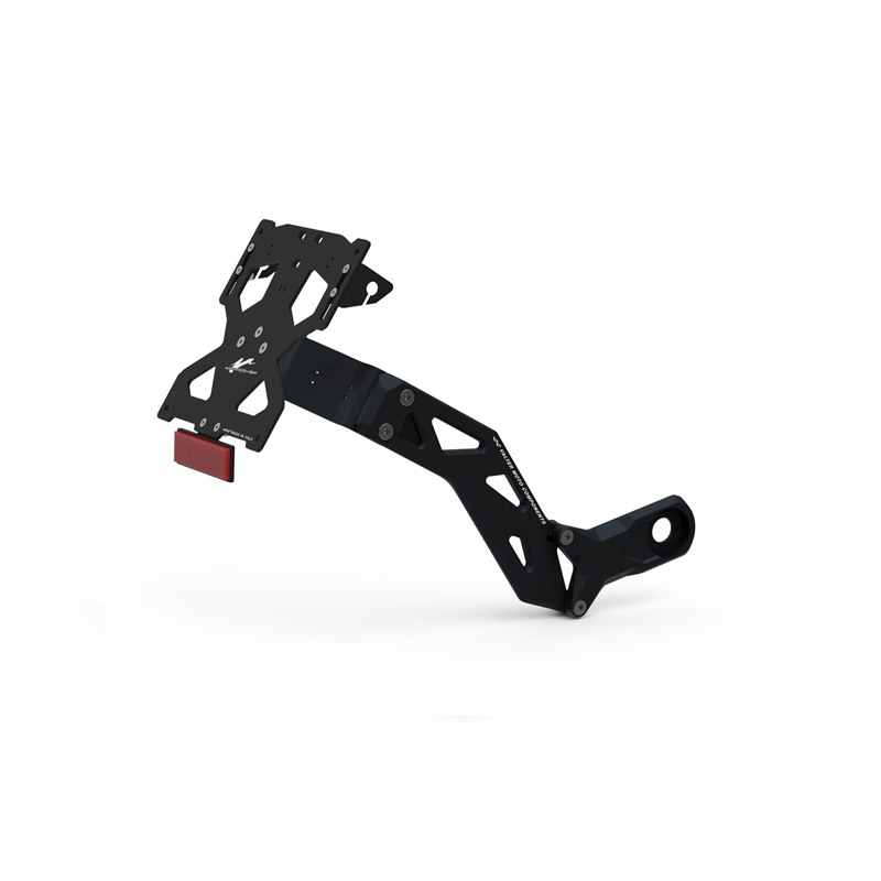 Il portatarga KING sviluppato da VMC permette di spostare la posizione della targa da sotto il codone alla zona vicina alla ruota posteriore. Il sistema di fissaggio al forcellone è realizzato in Ergal 7075 lavorati dal pieno con macchine CNC. Il sistema di montaggio offre diverse possibilità di regolazione della piastra portatarga per trovare il posizionamento desiderato. Nella confezione è inoltre incluso il cablaggio per connettere la luce targa e le frecce all'impianto della moto. Il kit di montaggio incluso comprende tutti i componenti necessari per il montaggio. Viene fornita anche una piastrina in acciaio per coprire il foro lasciato sotto il codone dal portatarga di serie. La luce in alluminio led è inclusa. (PRTL03) colore nero.