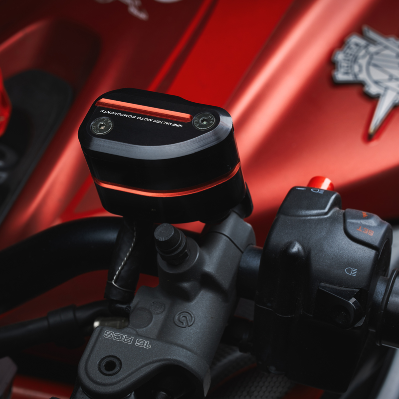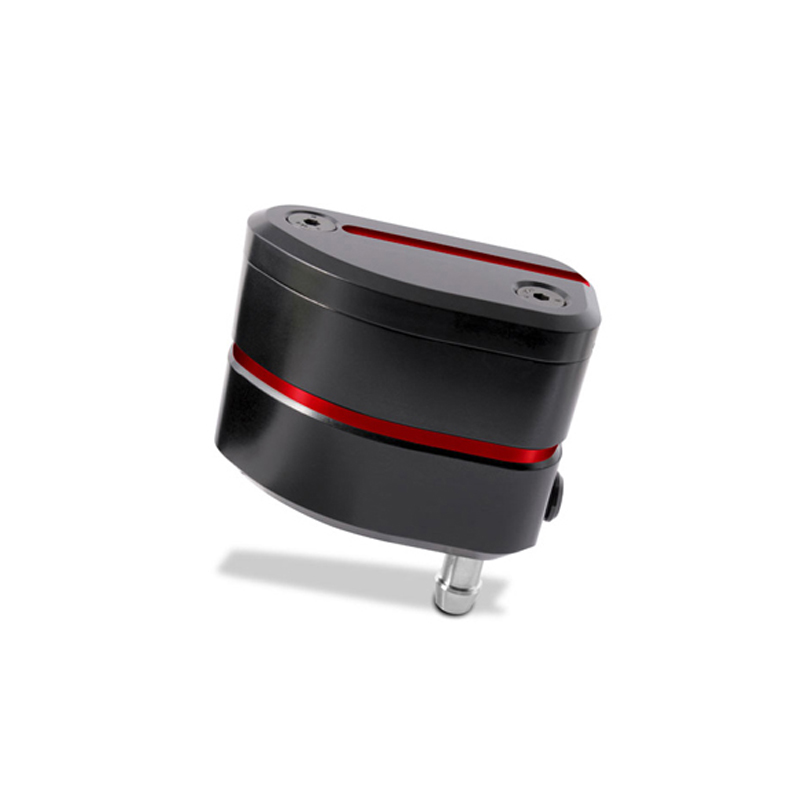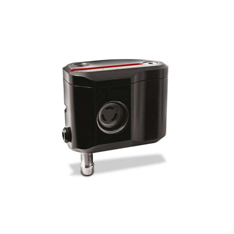Serbatoio olio frizione interamente realizzato in lega di alluminio lavorata con centri di lavoro CNC per garantire la massima qualità. Progettato su un design personalizzato VMC viene proposto nero con inserti colorati. Sul lato è presente la finestra per il controllo del livello dell'olio. Il serbatoio è dotato di due possibilità di uscita del tubo dell'olio, una laterale ed una inferiore. Il coperchio, anch'esso realizzato in alluminio, è come il corpo nero con inserti colorati. Prodotto compatibile con tutte le pompe freno con serbatoio esterno.