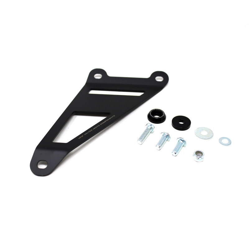 La staffa supporto silenziatore VMC è realizzata in robusto acciaio ed è di facile montaggio al posto di quella di serie. È più leggera della staffa originale e viene fornita con un distanziale conico in alluminio marchiato VMC per il fissaggio del silenziatore.