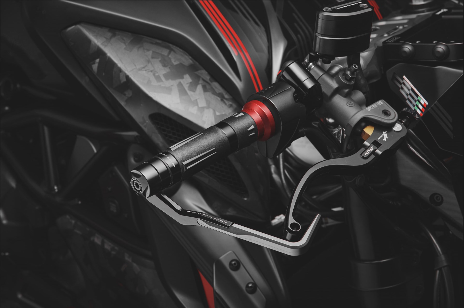 Non potevano mancare gli accessori Valter Moto Components come: il portatarga alla ruota con piastra in titanio e faro posteriore led, protezioni carter in alluminio, paratelai, manopole e protezioni leve. Tutte le parti in carbonio sono state sostituite da componenti realizzati con un’inedita nuova tipologia di carbonio pressofuso ad altissima resistenza, prodotti da Carbonvani.